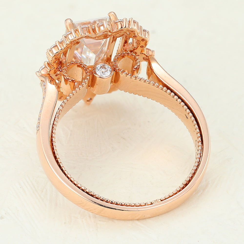 Delicate 0.55 TCW Round-cut Moissanite side stones frame the center, adding soft brilliance and balance to the overall silhouette.